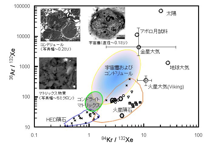 太陽系物質の起源と進化過程の解明をめざして、地球外物質の元素・同位体分析を行っています。これまでにコンドライト隕石や火星隕石、宇宙塵(直径ミリメートル以下の微粒子)、はやぶさ探査機が持ち帰った微粒子など、様々な物質の分析を行っています。地球などの惑星や小惑星、彗星などを構成している固体物質はそれらが形成した環境や材料物質、その後に経験した出来事を反映した様々な特徴をもっています。それらの特徴をできるだけ多く取得するために、顕微鏡による観察、機器を用いた元素組成分析や同位体質量分析など多岐にわたる分析を行っています。特に「希ガス」専用の高感度質量分析計を用いた地球外物質の分析を主に行っている世界的にも数少ない研究室のひとつです。希ガス同位体からは、物質の起源(太陽系以外の星で出来た粒子なども識別できる)や進化過程(粒子が形成された時期、経験した加熱温度など)を知ることができます。