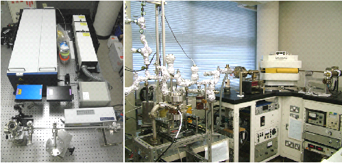 当研究室の希ガス質量分析計では隕石や宇宙塵などに含まれる原子数1万個程度の希ガス同位体を検出することができ、はやぶさ試料のような微小試料の分析も可能です。さらに、レーザーを用いた局所ガス抽出および、「レーザー共鳴イオン化+飛行時間型質量分析計」を取り入れた新しい質量分析装置の開発が行っています(右図)。