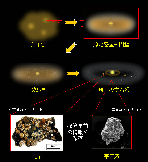 モデルを作成しただけでは、それが正しいのかどうかの証拠がありません。 太陽系の初期のできごとの証拠は、地球のような大きな天体には、ほとんど残されていません。 地球は岩石が高温で融けて、重いものが沈み、軽いものが浮かぶということを繰り返してきました 。岩石が融けるとそれまでの情報の大部分が失われてしまいます。 そこで、当研究分野では、小惑星からやってきた隕石や、彗星がまき散らした塵などを精密に分析して、 太陽系初期の情報を探っています。